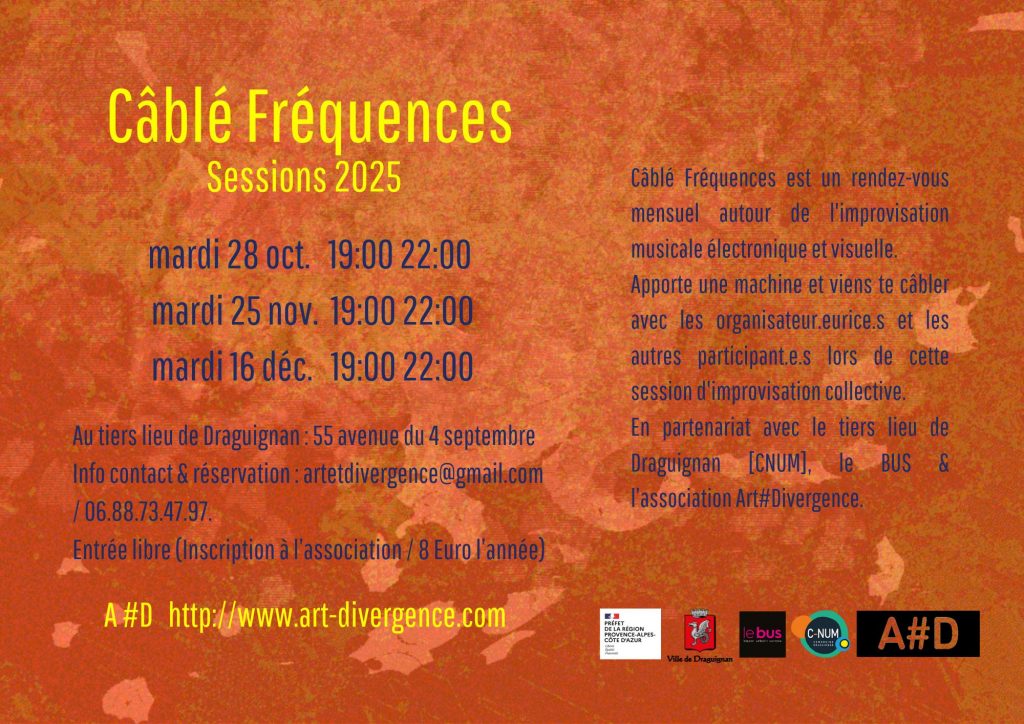 Chaque mois, nous nous donnons rendez-vous chez Art # Divergence [A # D] autour des pratiques de musiques électroniques improvisées en collectif et jouées en direct.